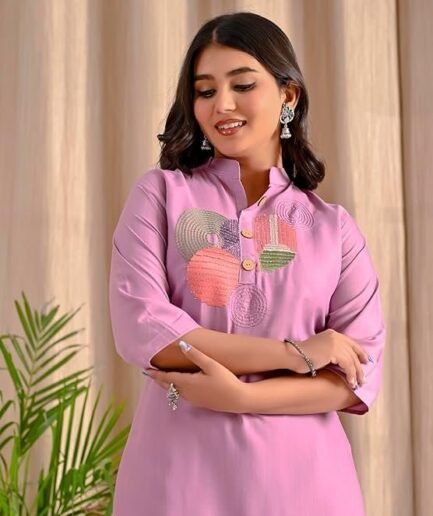 Select options This product has multiple variants. The options may be chosen on the product page Add to wishlist CompareRayon Slab Kurti with Colorful Embroidered Circles, 3/4 Sleeves, Collar Neck, Knee Length Kurti Pent Set for Women
